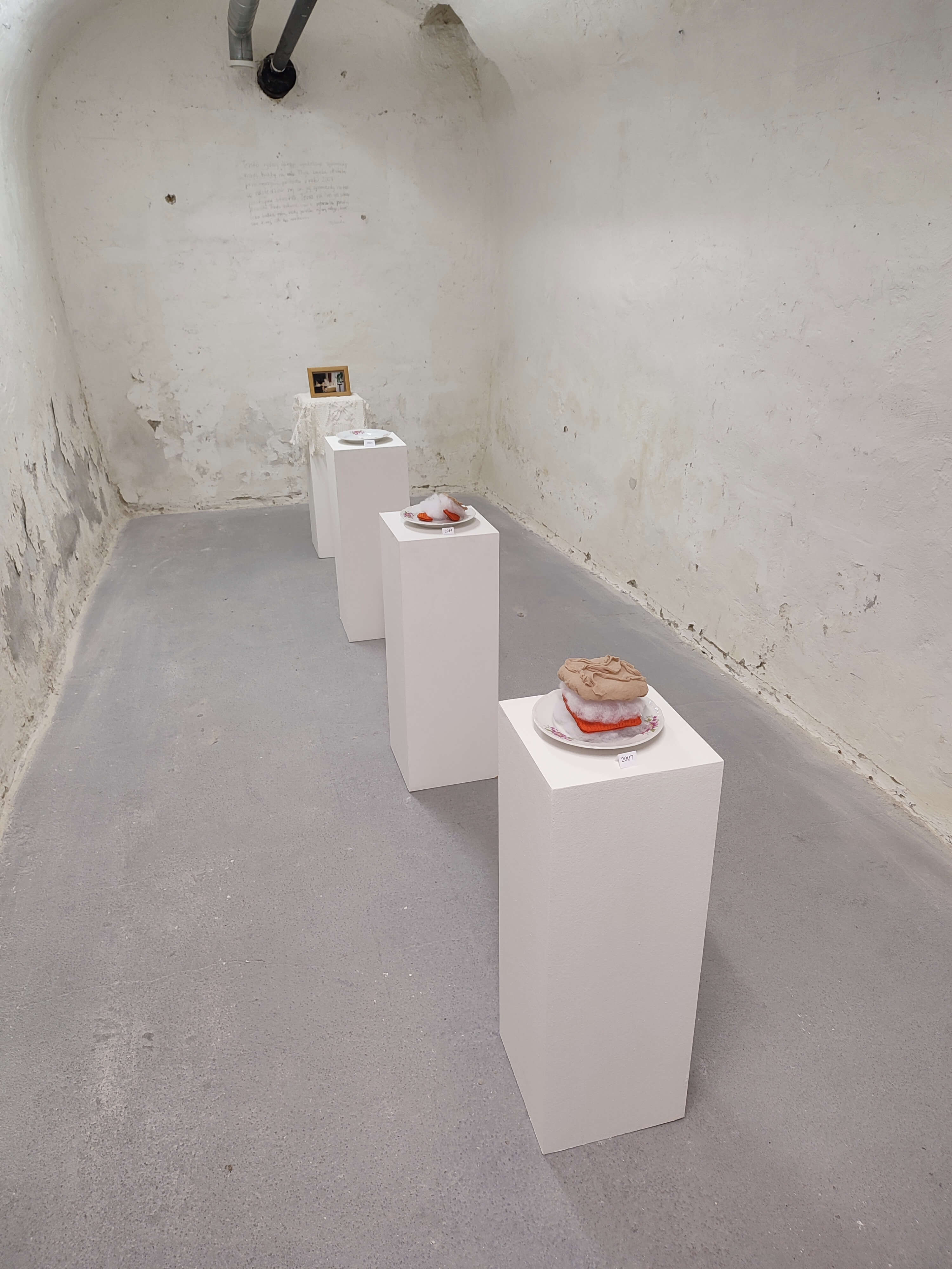 Na vernisáži predviedla študentka Mgr. Katarína Vidová Borguľová performanciu, na ktorej sa vyzliekala z množstva odevov, a nakoniec sa odlíčila. Podľa jej slov, posolstvom jej predstavenia bola skutočnosť, že počas života, hlavne v detstve, si tvoríme alebo preberáme presvedčenia o svete, o ľuďoch či o sebe. Tieto berieme ako nemenné pravdy, až pokým sa ukážu ako nepravdivé, či dokonca škodlivé. Aj keď väčšinou ich prvotnou úlohou bolo chrániť nás pred svetom, neskôr nám začínajú brániť v autenticite a slobode. Postupne vytvoria často priveľkú bariéru medzi vonkajším svetom a nami. Podľa slov autorky, význam performancie si môže vyložiť každý po svojom. Medzi nánosmi sú aj masky, ktoré nás „chránia“, ale sami si neuvedomujeme vlastné hry, a s rolou sa stotožníme, strácame sa v nej. Množstvo kapucní, ktoré si autorka diela dávala pomaly dole, malo symbolizovať schopnosť uvedomovať si svoje myšlienky a postupne sa nefunkčných „právd“ zbaviť ich prehodnotením, smerom k integrite.