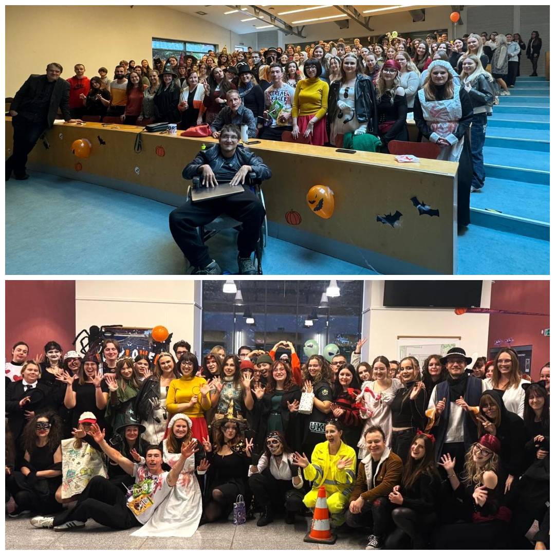 A čo nasledovalo potom? Vyučujúci a doktorandi z Katedry anglického jazyka a kultúry pripravili pre študentov občerstvenie, veselé tímové hry a keď slnko zapadlo, všetci si vzali voňavý popcorn a pozreli si halloweensku klasiku, Rodinu Addamsovcov.