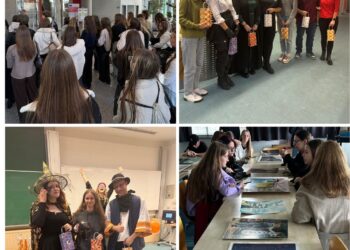 Popoludní už návštevníkov pri vchode do hlavnej budovy vítala strašidelná výzdoba. „Kajkloween“ sme však naplno odštartovali až po workshope Davida Fishera, ktorý sa podelil o svoje skúsenosti a ukázal našim študentom, ako možno dramatické techniky začleniť do vyučovacieho procesu.