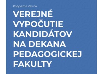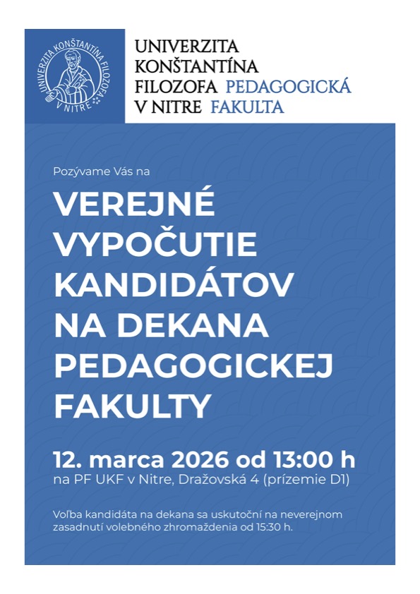 Akademický senát Pedagogickej fakulty UKF v Nitre Vás pozýva na verejné vypočutie kandidátov na dekana Pedagogickej fakulty UKF v Nitre. Verejné vypočutie sa uskutoční dňa 12. marca 2026 (štvrtok) o 13:00 hod. na PF UKF v Nitre, Dražovská 4 (pavilón B, prízemie, miestnosť D1).