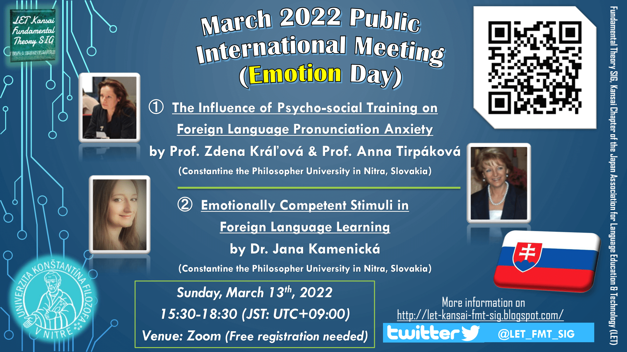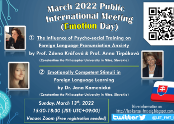 Dňa 13. marca 2022 prof. PaedDr. Zdena Kráľová, PhD. (KAJaK PF UKF), Mgr. Jana Kamenická, PhD. (KAJaK PF UKF) a prof. RNDr. Anna Tirpáková, CSc.(KMAT FPVaI UKF) predniesli pozvané prednášky na podujatí Emotion Day,ktorú organizovala Japonská asociácia pre jazykové vzdelávanie a technológiu (The Japan Association for Language Education & Technology)– Kansai Fundamental Theory SIG http://let-kansai-fmt-sig.blogspot.com