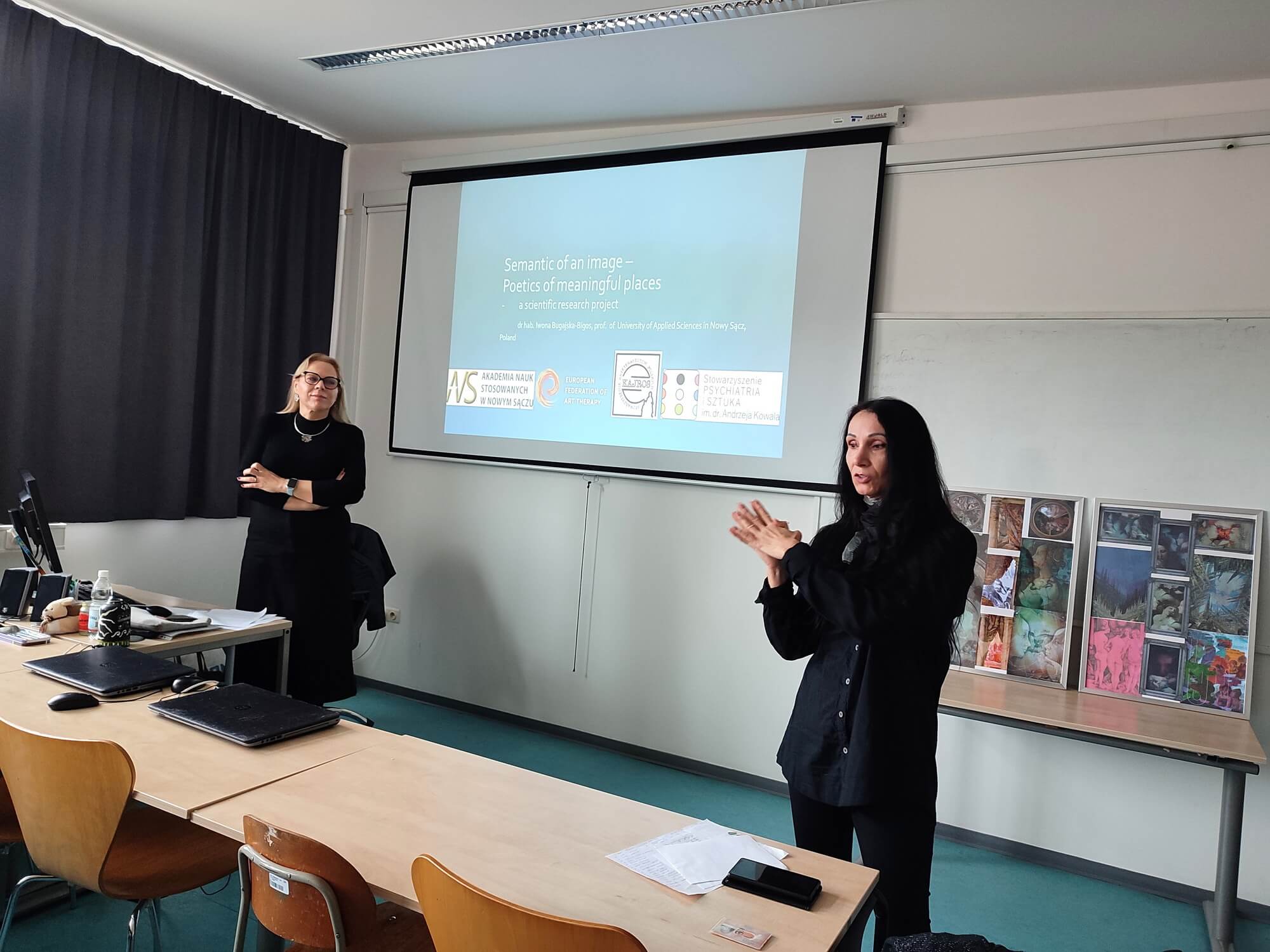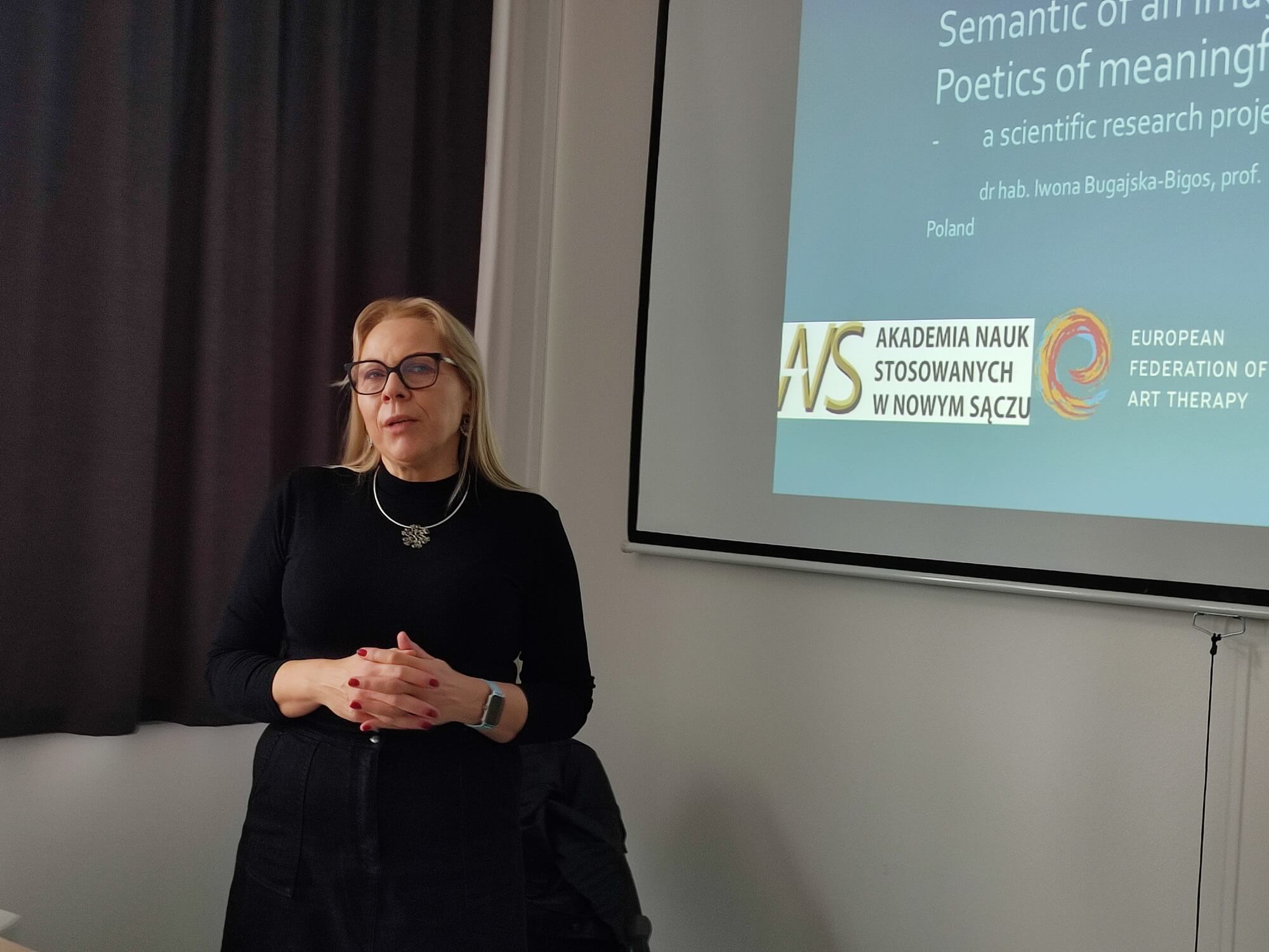 Prednášajúcou bola dr hab. Iwona Bugajska-Bigos, prof. ANS w Nowym Sączu v Poľsku, vedúca Katedry výtvarnej výchovy na Fakulte sociálnych vied a umenia Štátnej univerzity aplikovaných vied v Nowom Saczi v Poľsku (Akademia Nauk Stosowanych w Nowym Sączu, University of applied sciences in Nowy Sącz). Bola iniciátorkou založenia výtvarnej edukácie na jej univerzite a vytvorila nové výtvarné a dizajnérske študijné programy. Okrem učenia je aj aktívnou umelkyňou a pravidelne vystavuje. Prednáška prezentovala výsledky interdisciplinárneho projektu NR DNR.501-15/2023 realizovaného v spolupráci dvoch univerzít: Univerzity aplikovaných vied v Nowom Sączi a Pomoranskej univerzity v Słupsku, spolu s partnermi z Poľska – jednotlivcami so zdravotným postihnutím. Ďalšími spolupracovníkmi boli študenti KVTV PF UKF v Nitre pod vedením doc. PhDr. Adriany Réckej, PhD. V tomto projekte sa ako výskumná metóda použilo umenie. Prezentácia načrtla ciele projektu, podrobne opísala mnohostranné aktivity zahŕňajúce vizuálne umenie v arteterapii a auto-arteterapii, ako aj inkluzívny charakter výskumu založeného na umení. Do projektu sa zapojili vysokoškolskí študenti a mladí ľudia z inštitúcie „MADA Occupational Therapy Workshops“ v Nowom Sączi a výsledky podčiarkujú úlohu umenia pri skúmaní novej metodológie výskumu.