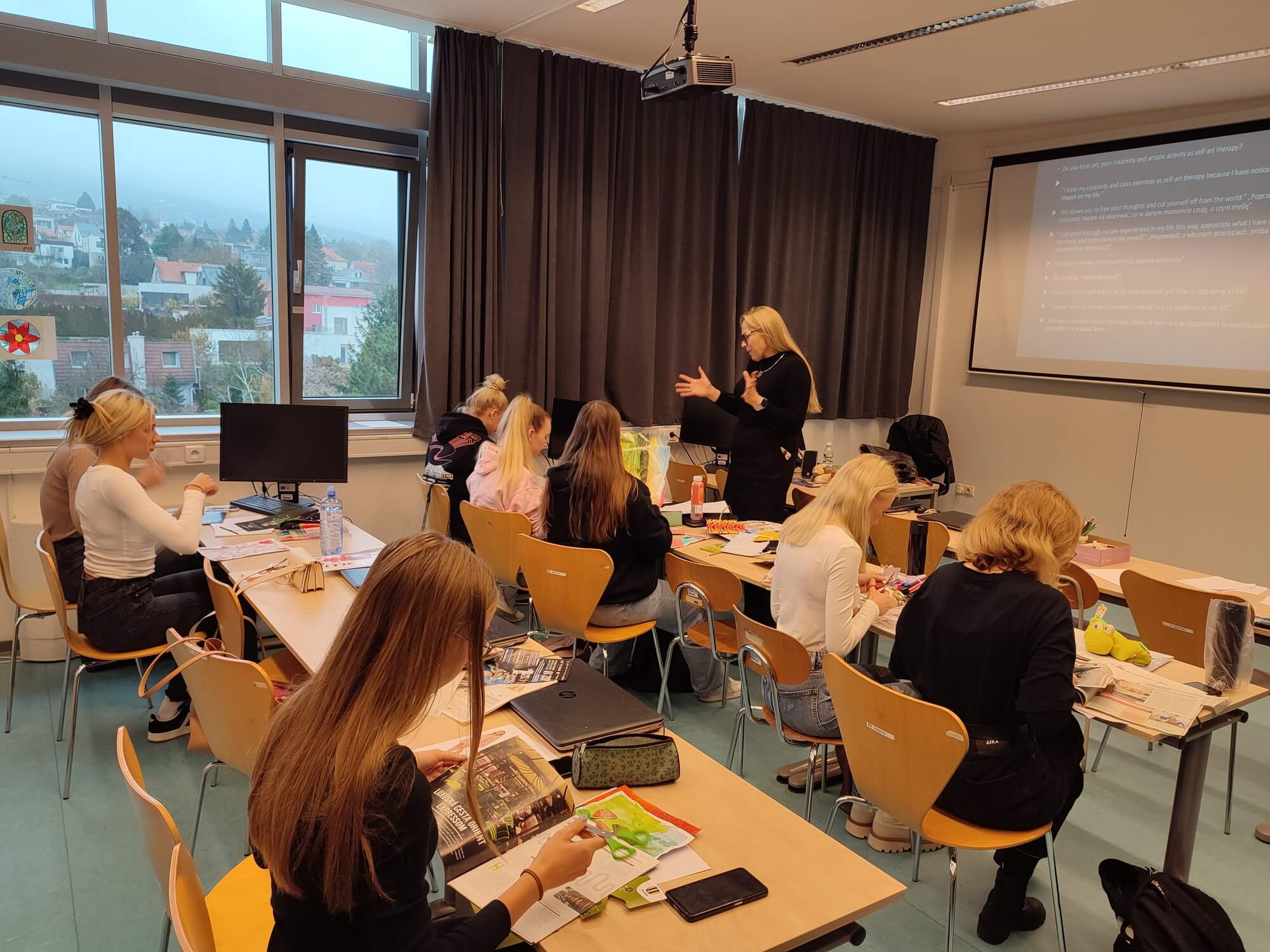 Both the lecture and the workshop were part of the planned lectures by domestic and foreign experts within the KEGA project no. 020UKF-4/2024 “Innovation of university training of art teachers in connection with the needs of 21st century society”, project “ (responsible researcher: doc. PhDr. Adriana Récka, PhD.), the main goal of which is to innovate the content of the university training of future art teachers, in line with the current challenges and needs of educational practice, in the context of the needs of 21st century society, which result from several objective economic, technological, as well as cultural and social determinants. In today’s challenging times, the ability to self-art therapy is important especially for professions that require working with people. The teacher is exposed to pressure, which results from his duties and the feeling of responsibility for the education of pupils and students. One of the ways to relieve stress is artistic creation aimed at expressing the inner world, for the sake of self-knowledge and the development of emotional intelligence.