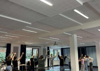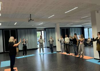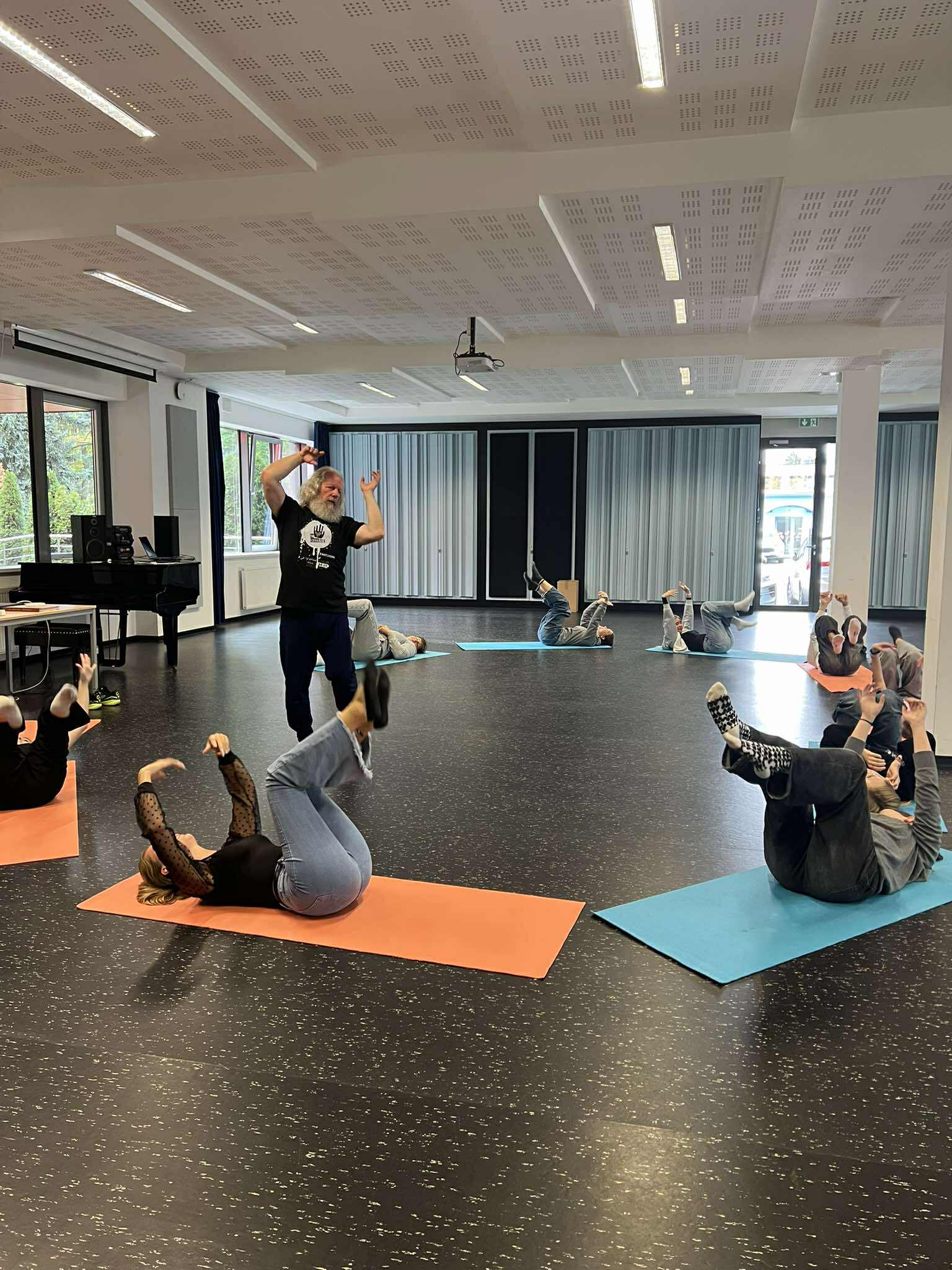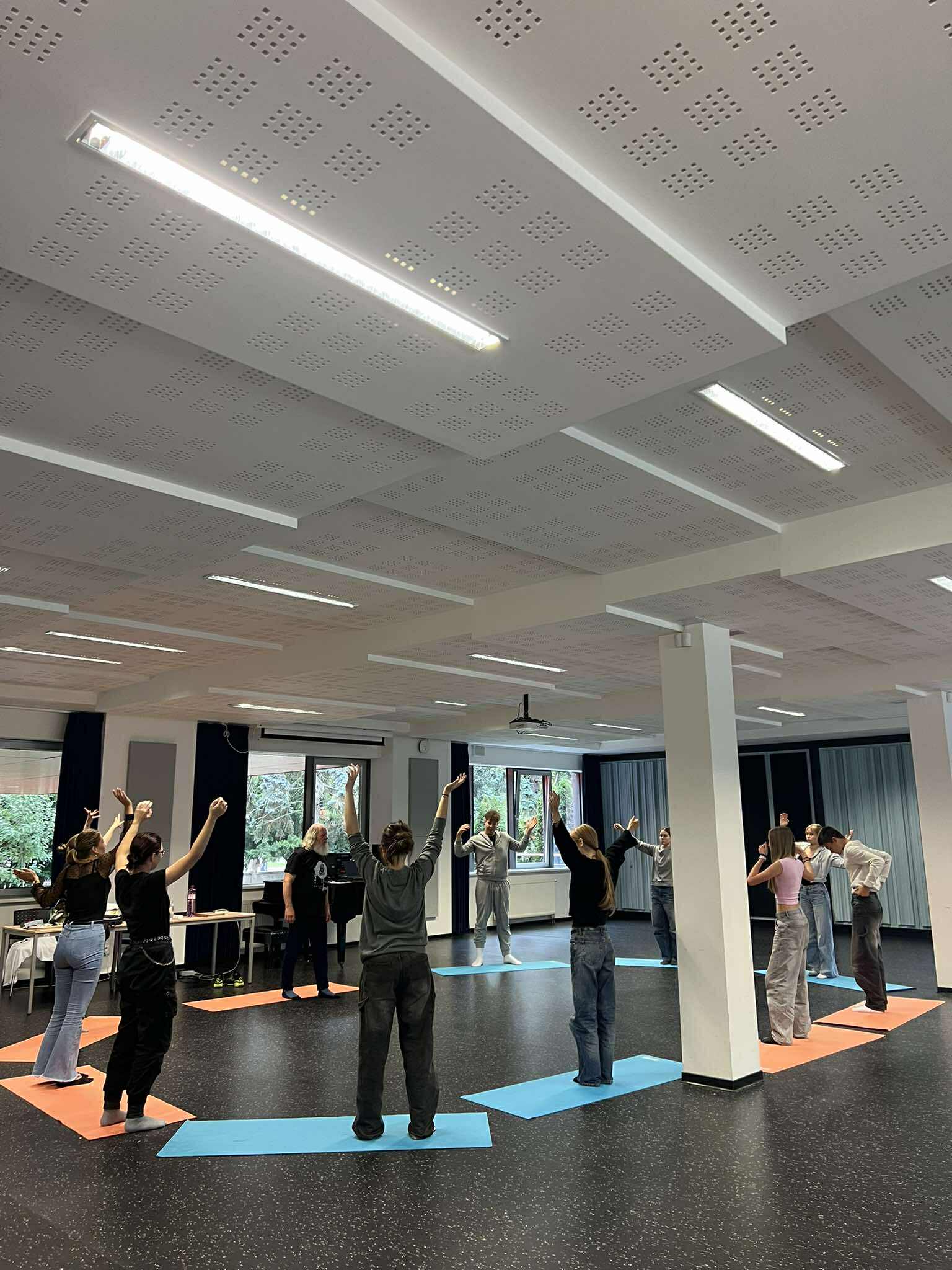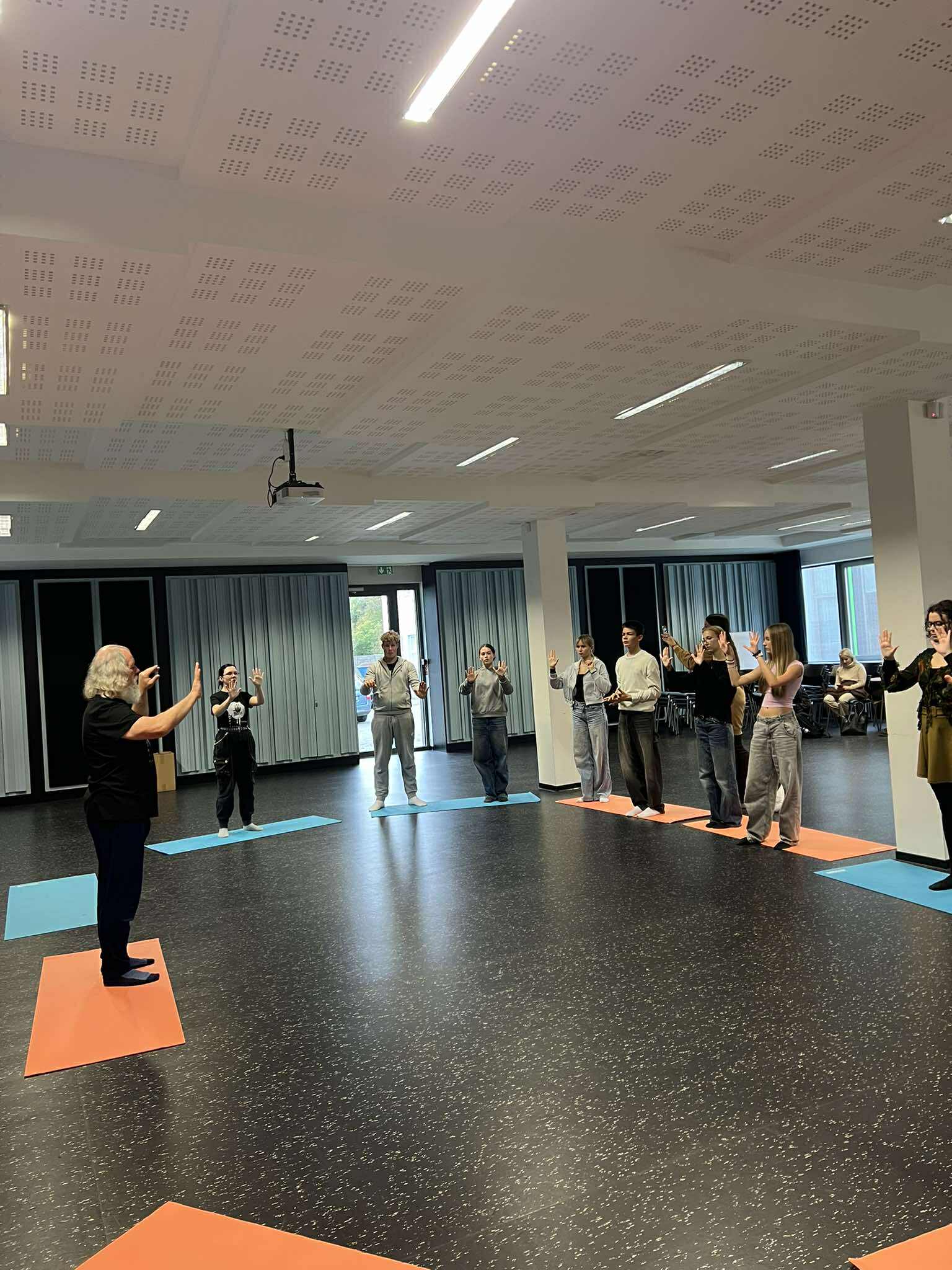 Prvý workshop dňa 9.10. 2025 s názvom Mímologia, ktorý bol zameraný na javiskový pohyb a pantomímu, sa uskutočnil pod vedením Miroslava Kasprzyka, herca a uznávaného míma, spoluorganizátora známeho a jedinečného festivalu pantomímy a pohybového divadla PAN s 30-ročnou tradíciou. Študenti museli vystúpiť z komfortnej zóny a sami si pod vedením pána Kasprzyka skúšali pohybové a pantomimické cvičenia. Bezprostrednosť a charizma pána Kasprzyka pomohli uvoľniť atmosféru, a iba chvíľu od výzvy na spoluprácu sa všetci študenti nadšene zapájali. Okrem študentov Katedry hudby PF UKF sa k tomuto workshopu pridali aj študenti Súkromnej základnej umeleckej školy Tralaškola v Nitre, čím prispeli k dobrej tvorivej atmosfére a my im za účasť ďakujeme.