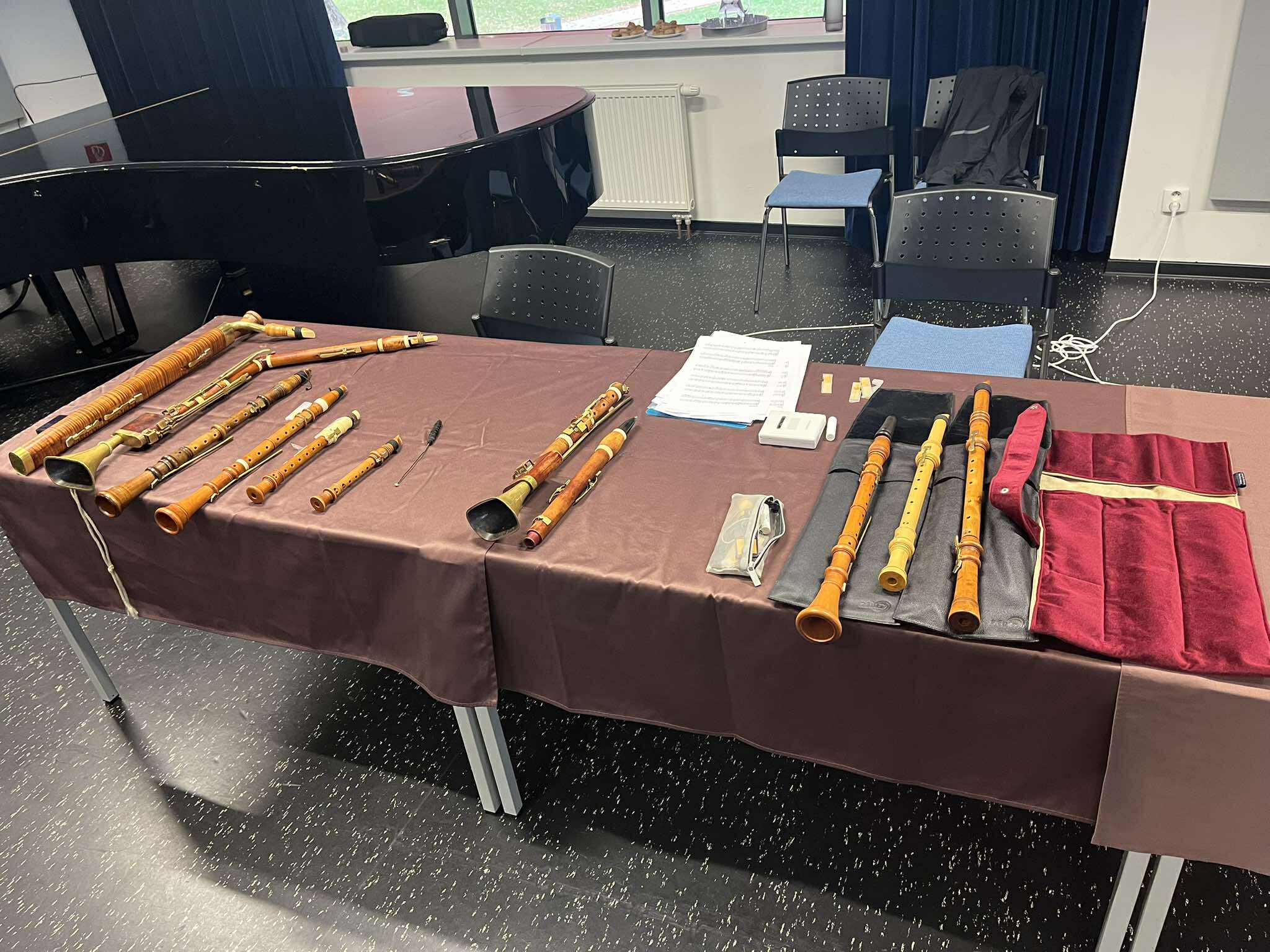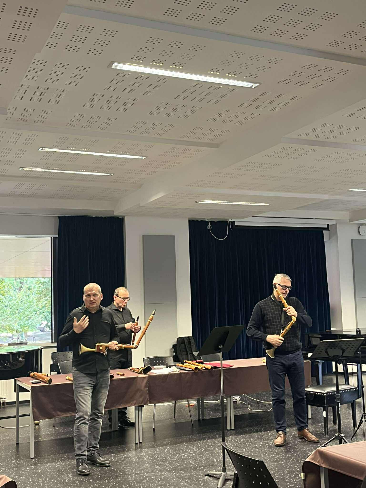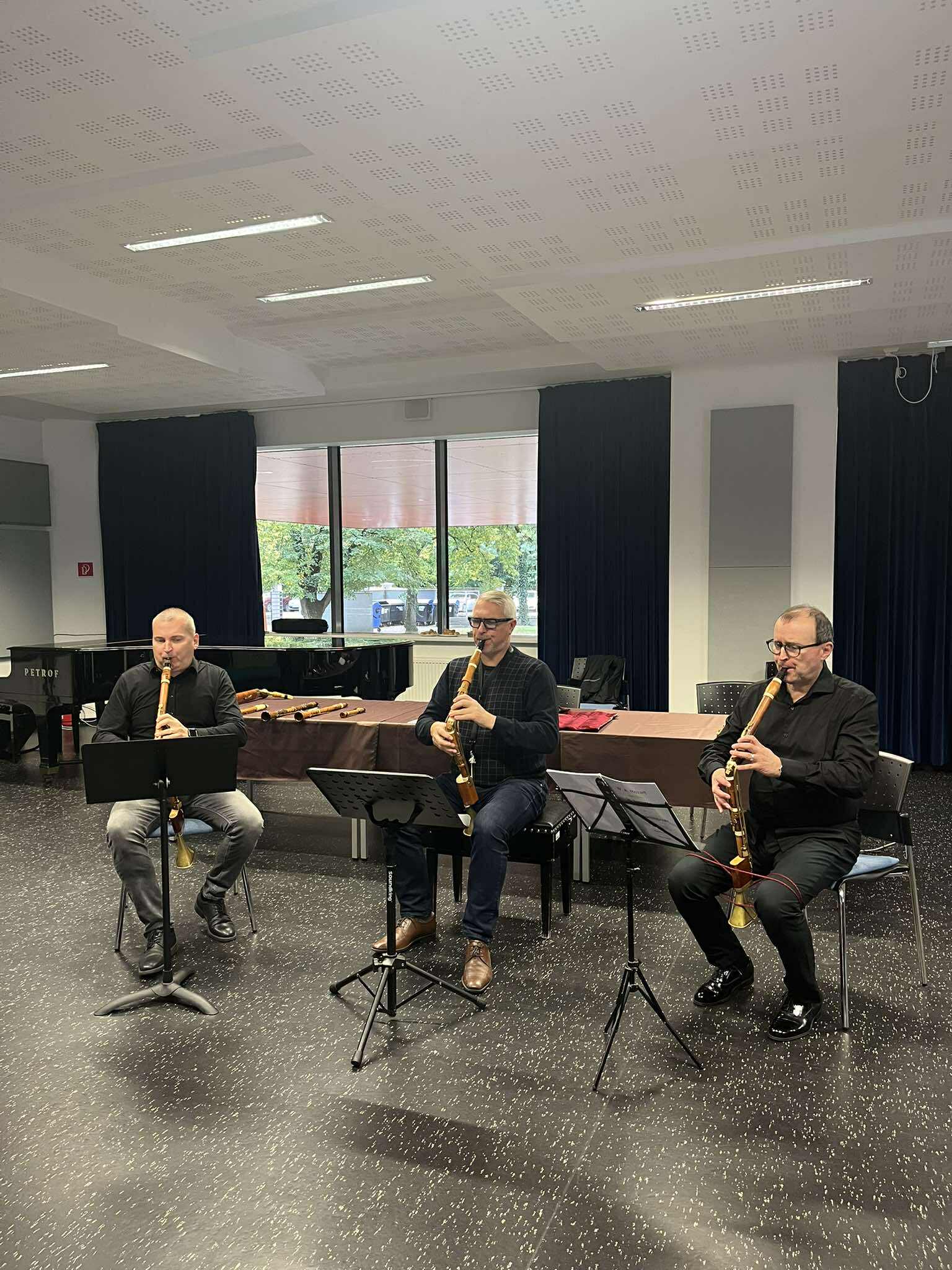 Na druhom stretnutí Umeleckej kaviarne, ktoré sa konalo 14.10.2025, prijali naše pozvanie páni z hudobného zoskupenia Lotz Trio, a priniesli do našej „kaviarne“ projekt Clarinettorium. V rámci tohto projektu mali naši študenti možnosť spoznať mnohé historické dychové nástroje, medzi ktorými sa nachádzali aj jedinečné unikáty nevyčísliteľnej hodnoty, ktorých počet sa v celosvetovom meradle počíta len na niekoľko kusov. Zároveň študentom na týchto nástrojoch odohrali hudobné ukážky, čím určite inšpirovali aspoň niekoľko študentov k bližšiemu oboznámeniu sa s historickými dychovými hudobnými nástrojmi. Hudobníci boli otvorení aj diskusii a ochotne odpovedali študentom na otázky, ktoré ich zaujímali.