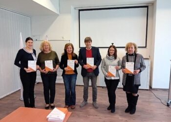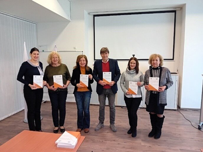 Slávnostné uvedenie učebnice do života počas záverečného bilaterálneho stretnutia zástupcov riešiteľských tímov projektu konaného v dňoch 14. – 16. decembra 2023 na UKF v Nitre: členovia autorského kolektívu (zľava): Branka Radulović, Zdenka Gadušová, Ljiljana Knežević, Igor Lomnický, Ljubica Ivanović Bibić, Alena Hašková