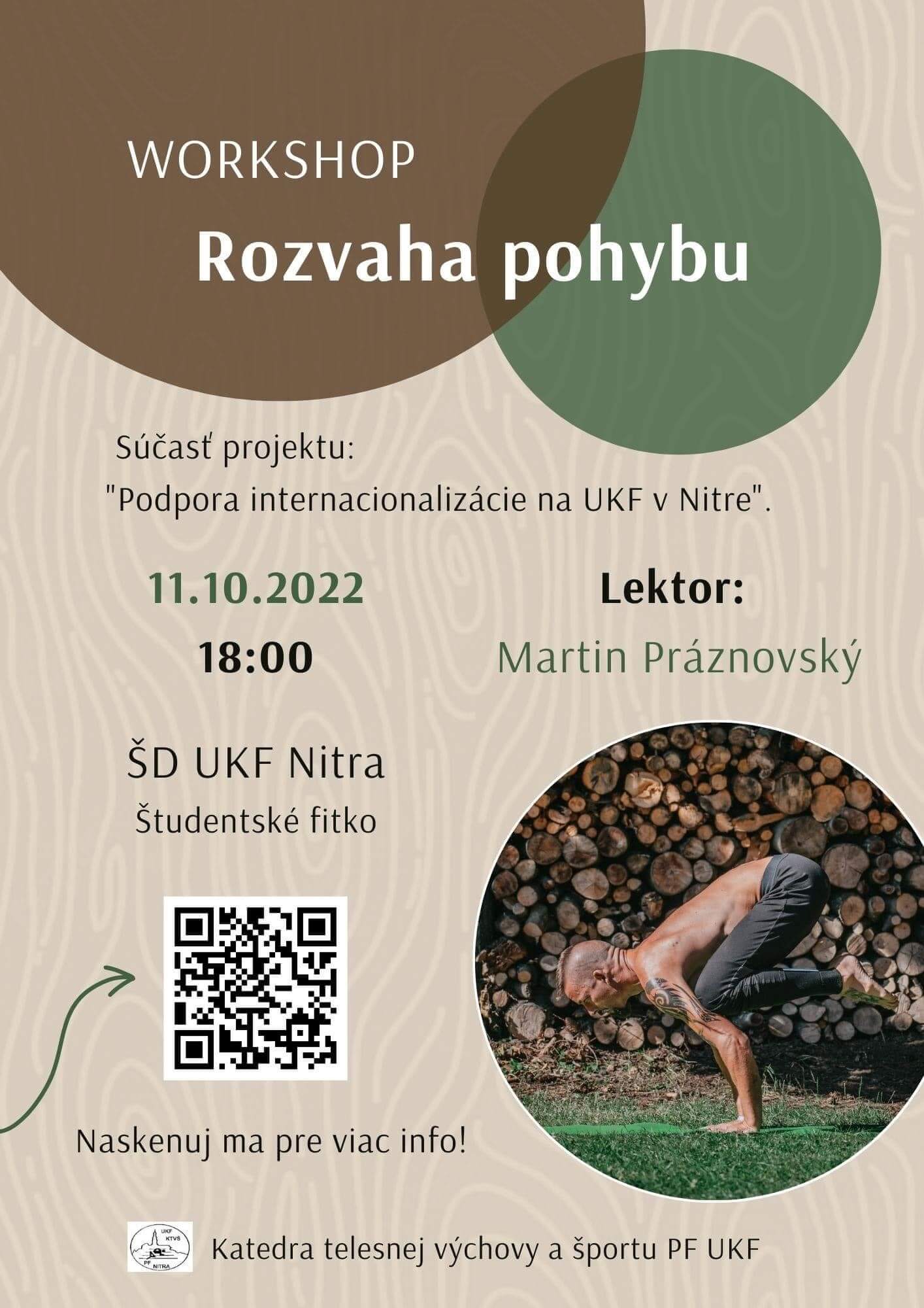 11.10.2022 v priestoroch Fitštúdia UKF v Nitre Katedra telesnej výchovy a športu PF UKF zorganizovala WORKSHOP pod názvom Rozvaha pohybu. Workshop sa konal v rámci projektu „Podpora internacionalizácie na UKF v Nitre“. Hlavným cieľom workshopu bolo oboznámiť študentov s odbornou športovou terminológiou v praxi. Na workshope sa zúčastnili domáci aj zahraniční študenti UKF z rôznych študijných programov. Pozvanie prijal inštruktor Martin Práznovský, ktorý sa metódou metódou sebarozvoja cez vlastné telo venuje už dlhšie. Toto cvičenie kombinuje prvky jogy, kalisteniky, akrobacie, tanca a bojových umení. Študenti si okrem zaujímavého cvičenia mohli osvojiť terminológiu jednotlivých cvičení.
