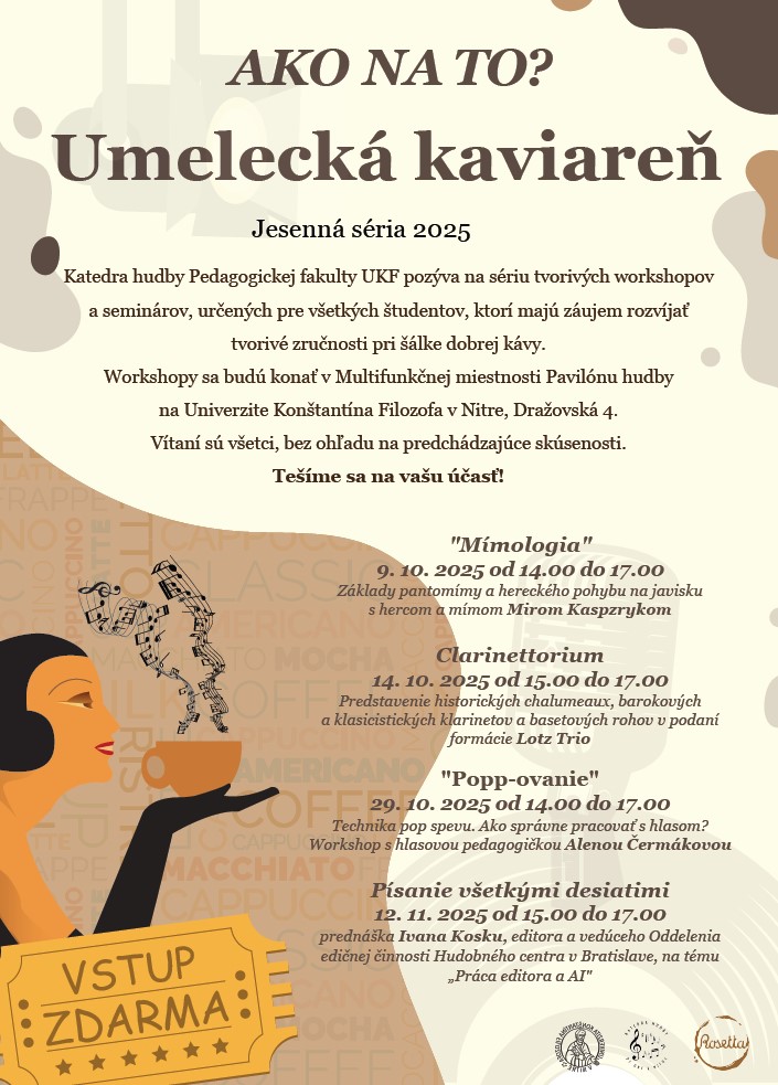 Katedra hudby Pedagogickej fakulty UKF v Nitre pozýva na cyklus workshopov s hlavným názvom "Umelecká kaviareň - Ako na to?" v termíne od 9.10.2025 do 12.11.2025. Tvorivé workshopy sa konajú v štyroch termínoch, prebiehajú na Katedre hudby PF UKF a sú určené všetkým študentom a pedagógom. Prvý workshop s názvom "Mímologia" sa uskutoční už tento štvrtok 9.10.2025 od 14.00 - 17.00 v Multifunkčnej sále Katedry hudby PF UKF, pod vedením herca a míma Miroslava Kasprzyka. Nasledujúce podujatie Clarinettorium bude budúci týždeň 14.10.2025 od 15.00 - 17.00.